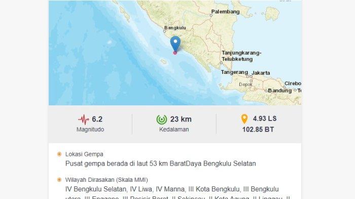Dilansir Twitter BMKG, gempa yang terjadi berkekuatan 6,2 Magnitudo yang berpusat di 53 km Barat Daya Bengkulu Selatan.