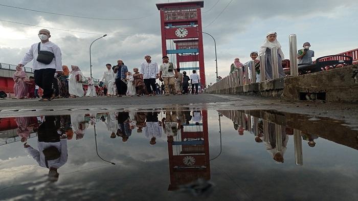 Demi Shalat Ied di Masjid Agung Palembang, Warga Jalan Kaki Lewati Jembatan Ampera