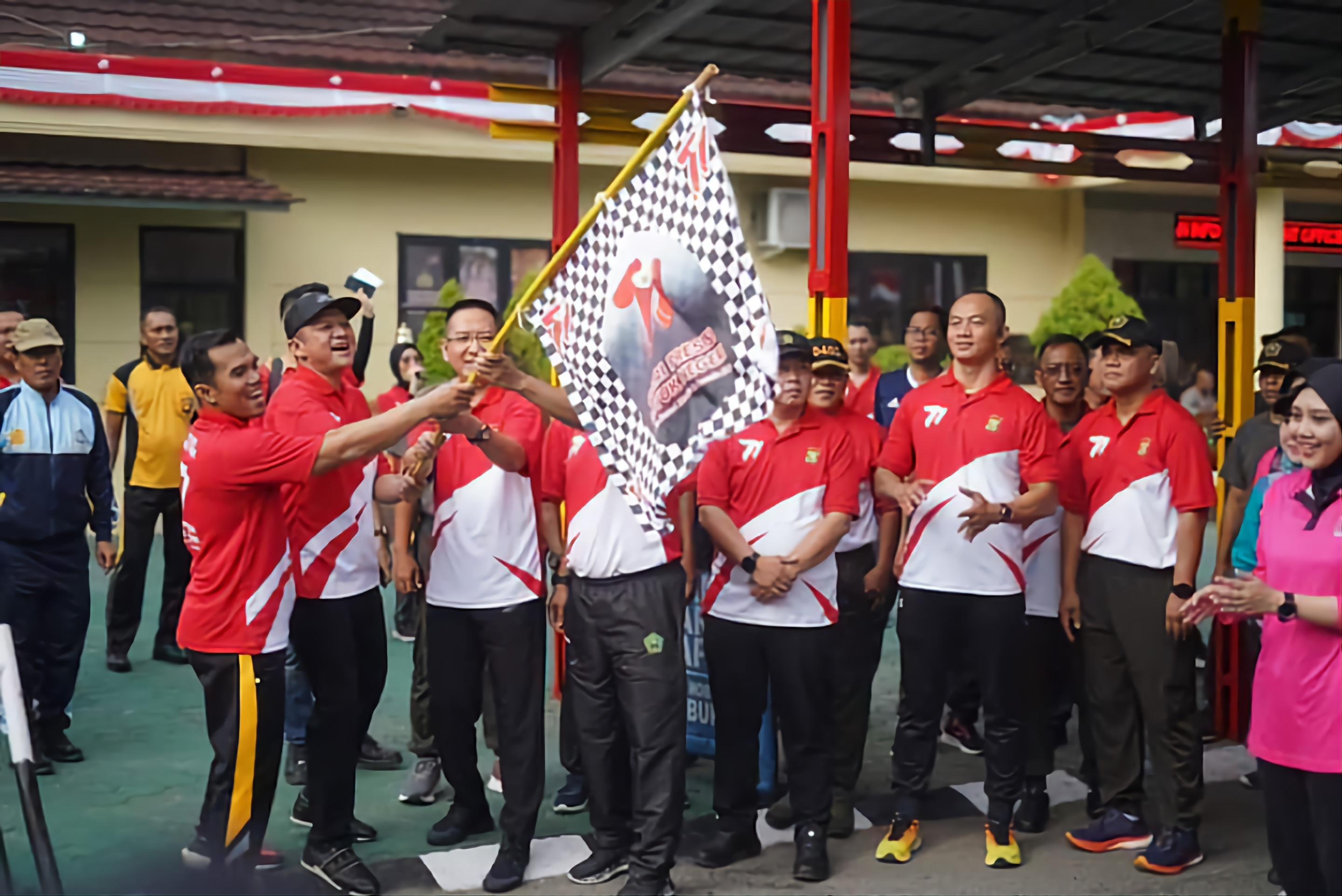 Olahraga bersama dilakukan dalam rangka menyambut Hari Bhayangkara ke-77 pada 1 juli 2023 mendatang.