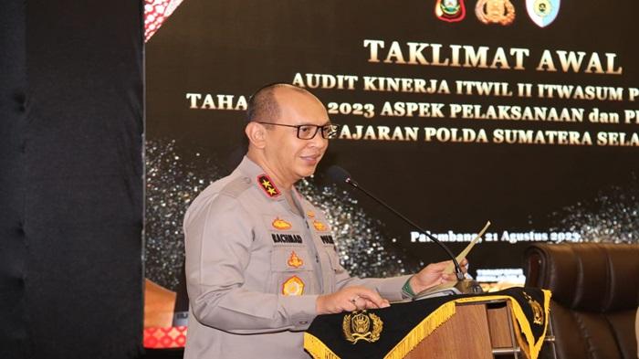 TRIBUNSUMSEL.COM,PALEMBANG- Taklimat awal audit kinerja Itwasum Polri Tahap II Aspek pelaksanaan dan pengendalian pada Satker dan Satwil Jajaran Polda Sumsel T.A. 2023 dibuka langsung Kapolda Sumsel Irjen Pol. A.Rachmad Wibowo SIK dan didampingi Wakapolda Sumsel Brigjen Pol M.Zulkarnain SIK MSI Pengawas Tim Audit Brigjen Pol.Drs Sjamsul Sidiq MH , Senin (21/08/2023).