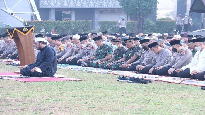 TRIBUNSUMSEL.COM, PALEMBANG - Kepolisian Daerah (Polda) Sumatera Selatan menggelar sholat Istisqo untuk memohon hujan agar bisa memadamkan api Kebakaran Hutan dan Lahan (Karhutla) di Sumsel, Jumat (15/9/2023).