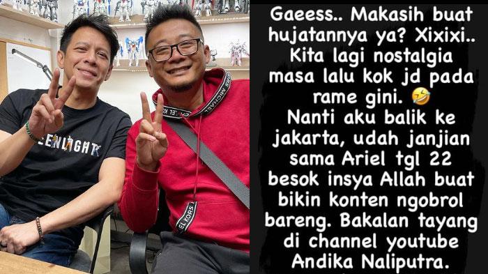 Nanti aku balik ke Jakarta, udah janjian sama Ariel tgl 22 besok Insya Allah buat bikin konten ngobrol bareng. Bakalan tayang di channel youtube Andika Naliputra, tungguin ya? Sambil nunggu, mau komen apa lagi pun bebass...," ujar Andika.
