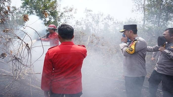 Wakapolda Sumsel dan rombongan termasuk sejumlah PJU Polres OKI melihat dari dekat proses pemadaman api yang dialkukan oleh personel dari Manggala Agni dan BKO Polda Sumsel, pada Kamis siang.