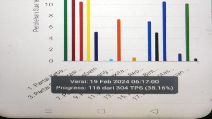 Data ini dilansir dari situs resmi KPU pada Senin 19 Februari pukul 06:17:00 WIB dengan progres 116 TPS dari 304 TPS atau 38.16 persen.