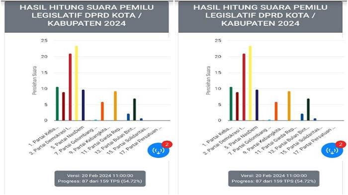 Data ini dilansir dari real count situs resmi KPU pada Senin 19 Februari pukul 14.00 WIB dengan progres 87 TPS dari 159 TPS atau 54,74 persen.