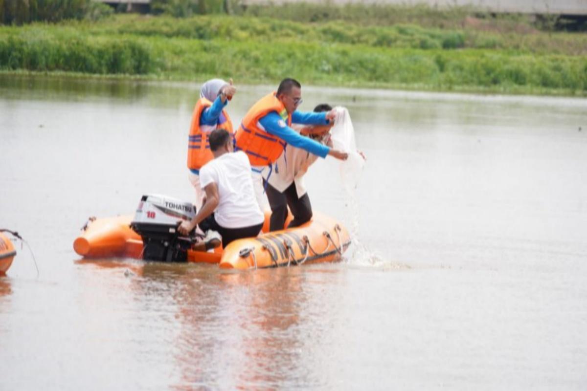 Pj Bupati Banyuasin Hani Syopiar Rustam Lepas 10 Ribu Bibit Ikan di Sungai Boom