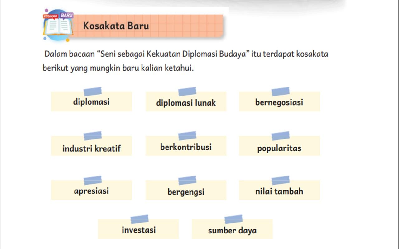 TRIBUNSUMSEL.COM- Pada halaman 40 buku Bahasa Indonesia kelas 6 SD siswa ditugaskan untuk melengkapi kalimat berdasarkan bacaan “Seni sebagai Kekuatan Diplomasi Budaya”.
