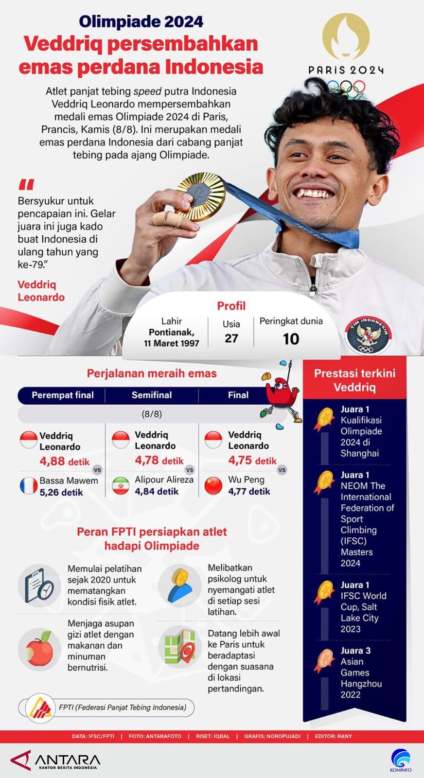 TRIBUNSUMSEL.COM- Atlet panjat tebing speed putra Indonesia Veddriq Leonardo mempersembahkan medali emas Olimpiade 2024 di Paris, Prancis, Kamis (8/8/2024).