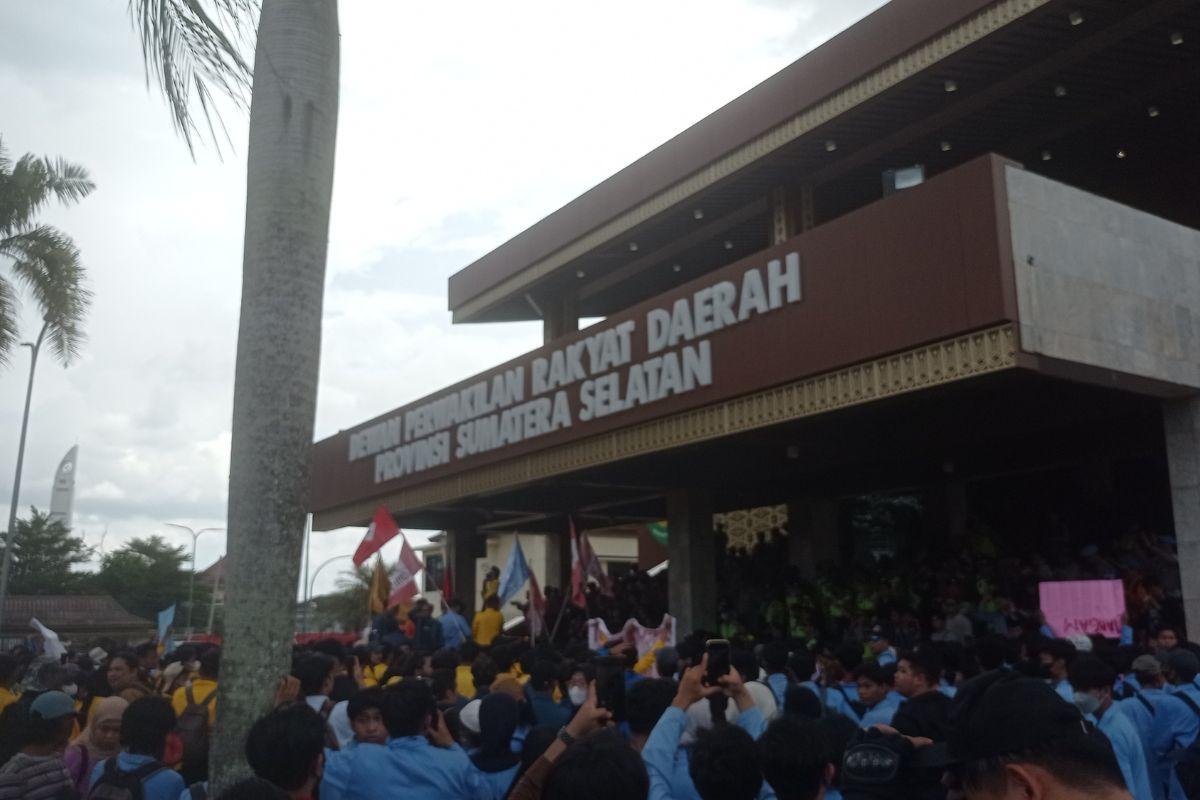 Sekitar seribu massa yang tergabung dalam Badan Eksekutif Mahasiswa (BEM) Sumatera Selatan (Sumsel) mengelar aksi unjuk rasa di Kantor DPRD Sumsel.