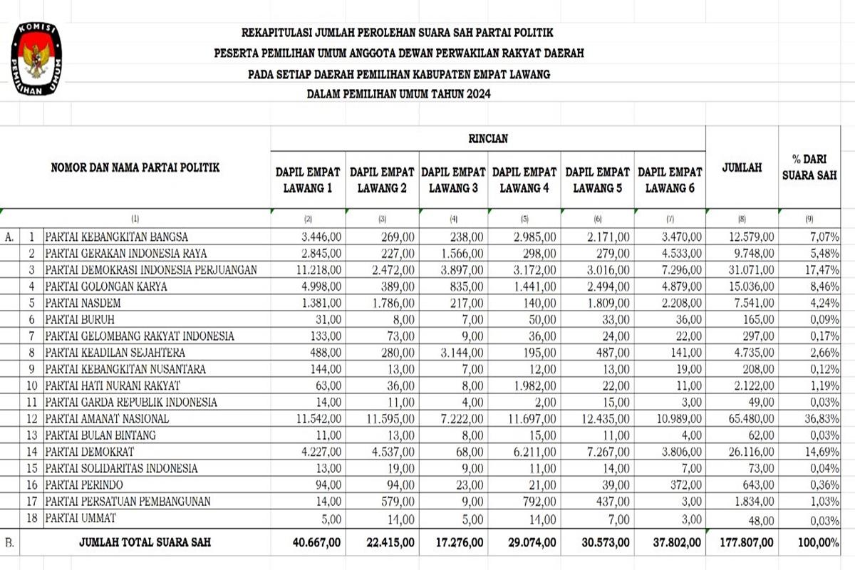 Khusus untuk di Kabupaten Empat Lawang dari 18 partai politik peserta Pemilu 2024 ada 7 partai politik yang menjadi pemenang.