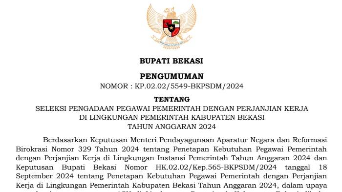 Dalam pengadaan Seleksi Pegawai Pemerintah dengan Perjanjian Kerja (PPPK) tahun anggara 2024, banyak instansi pemerintah baik pusat maupun daerah yang turut mengajukan alokasi formasi, salah satunya Pemerintah Kabupaten Bekasi.