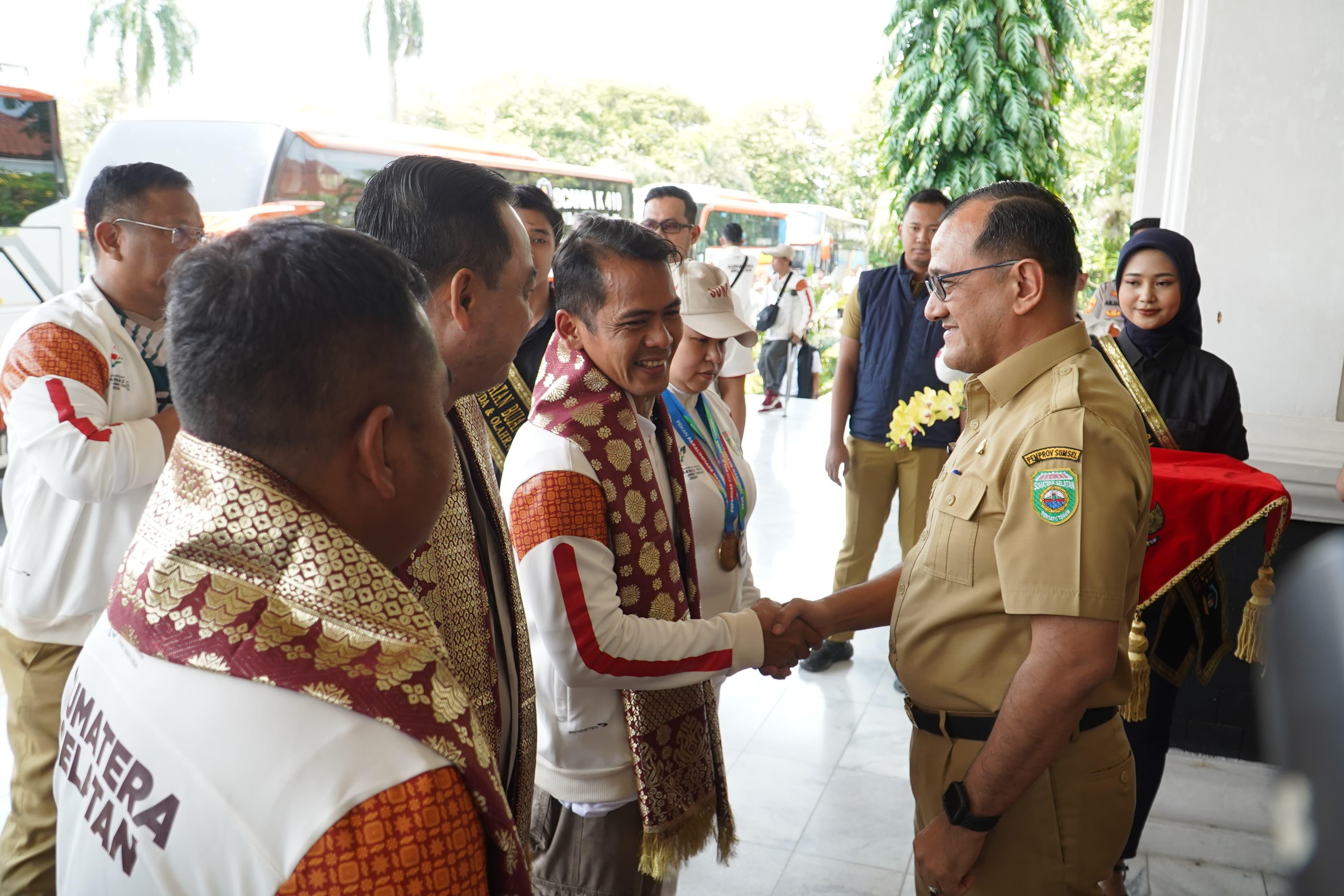 Sekretaris Daerah Sumsel, Edward Candra menyambut kedatangan Kontingen Provinsi Sumatera Selatan yang telah mengikuti Pekan Paralimpiade Nasional