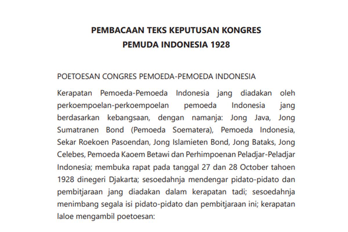 Teks Keputusan Kongres Pemuda Indonesia 1928 pada upacara Hari Sumpah Pemuda 2024 ini telah dibagikan melalui pedoman pada laman resmi Kemenpora.