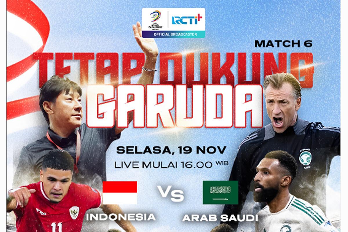 Siaran Langsung Kualifikasi Piala Dunia 2026 dan Live Streaming Bola Timnas Indonesia vs Arab Saudi dapat juga diakses via Live Streaming RCTI Plus serta Live Streaming TV Online Vision +.