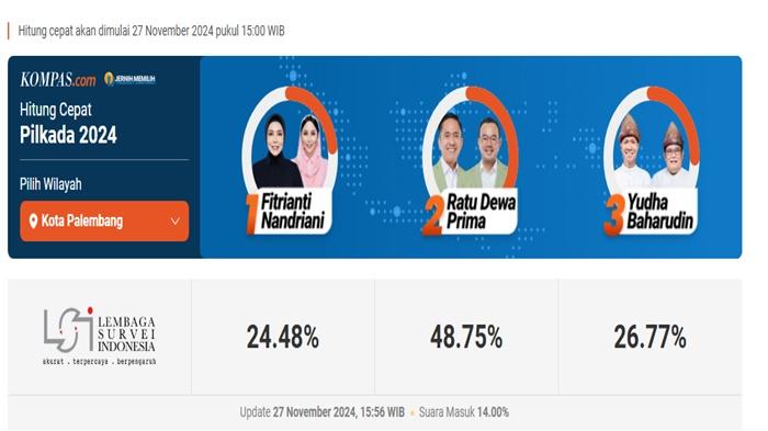 Berdasarkan hasil hitung cepat Lembaga Survei Indonesia (LSI), Ratu Dewa unggul dengan perolehan 48,75 persen di Pilkada Palembang 2024.