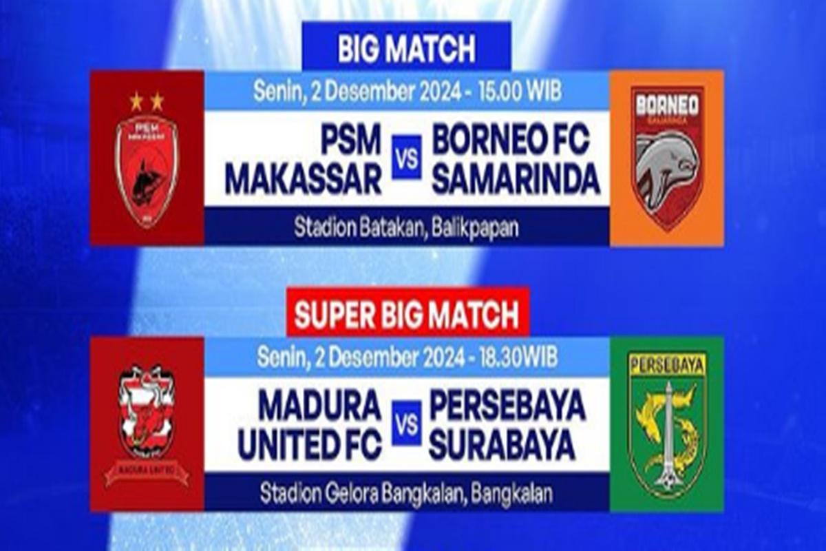 Jadwal Acara TV Senin 2 Desember 2024, PSM Makassar vs Borneo FC, Madura vs Persebaya di Indosiar