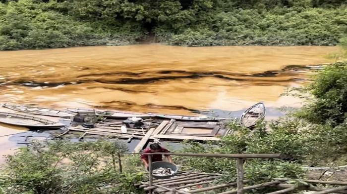 Kini sebuah sungai yang berada di Kecamatan Batanghari Leko yakni Sungai Lubuk Buah tercemar oleh minyak mentah yang mengalir di sungai, Sabtu (22/12/2024).