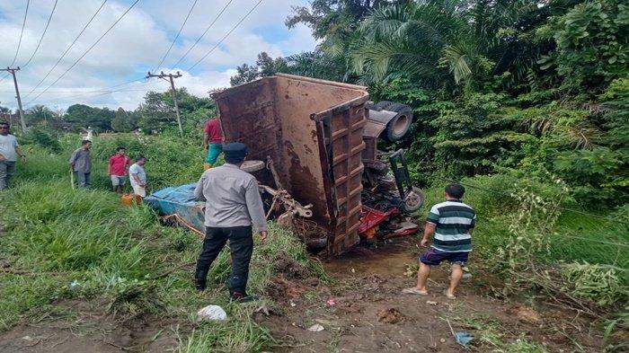 Diduga Tak Kuasai Jalur, Truk Terperosok di Tikungan Desa Karang Bindu Prabumulih, Sopir Luka Berat