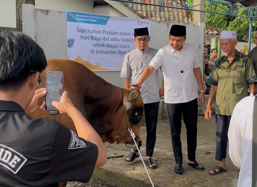 TRIBUNSUMSEL.COM, INDRALAYA - Bupati Ogan Ilir Panca Wijaya Akbar menyerahkan sapi kurban bantuan dari Presiden Prabowo Subianto pada Idul Adha 1446 Hijriah.