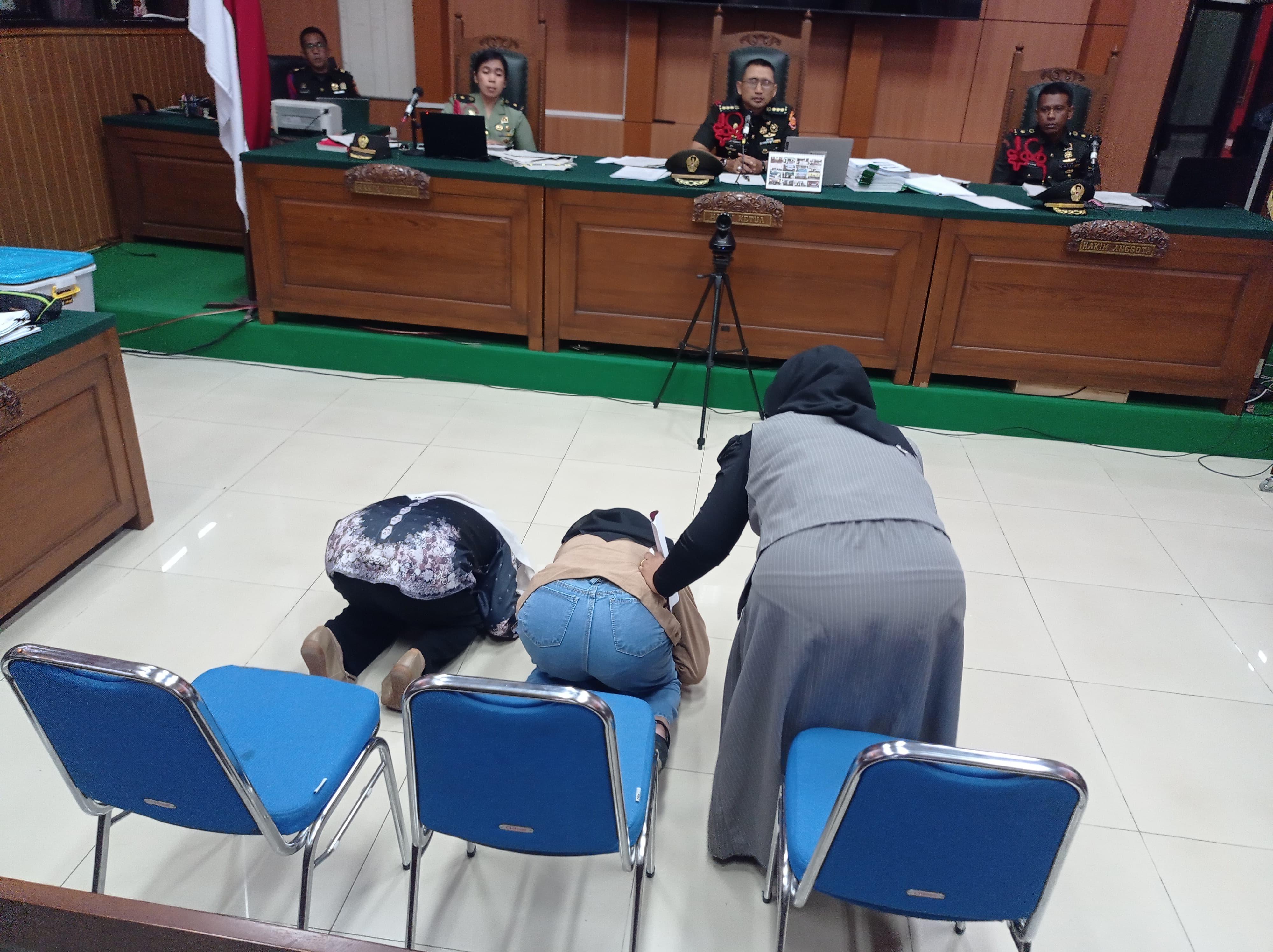 Setelah memberikan keterangan kepada majelis hakim dan Oditur militer, ketiganya kompak sujud di hadapan persidangan.