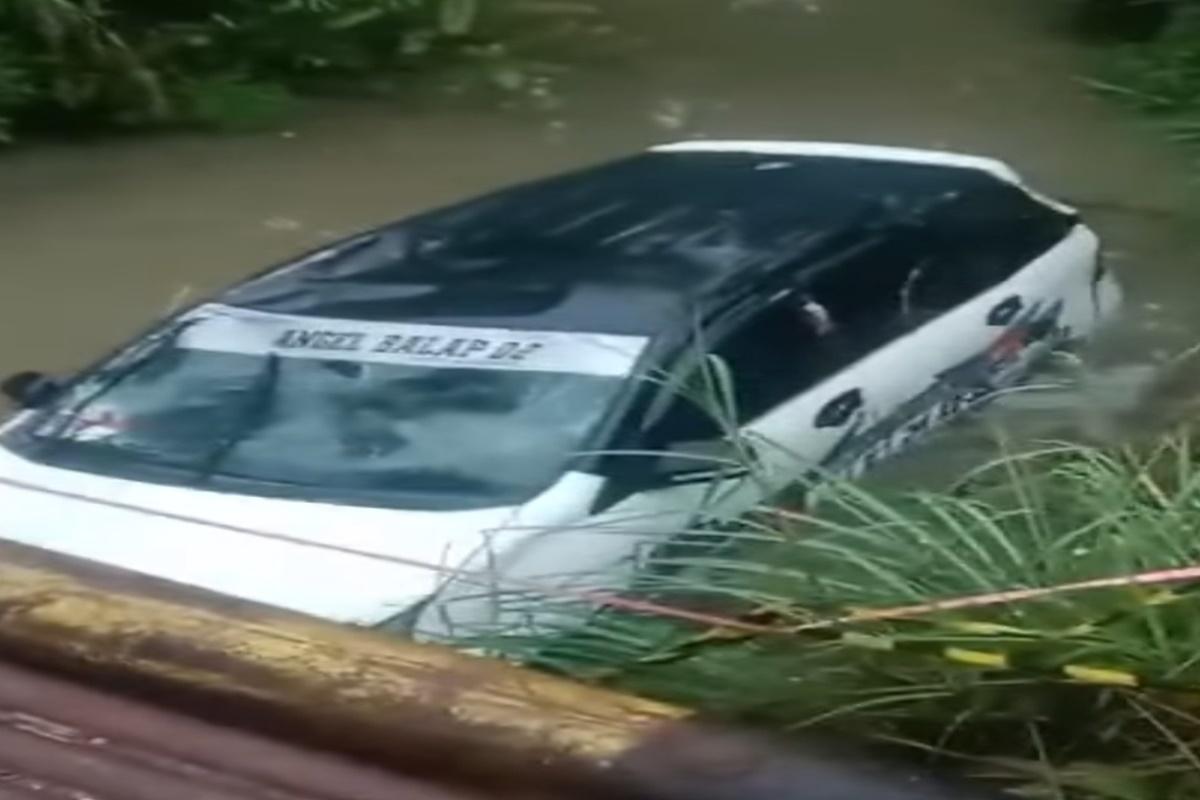 Dalam vidio berdurasi 11 detik, memperlihatkan mobil warga putih terjun ke sungai. Kejadian itupun menjadi tontonan warga dan pengguna jalan.