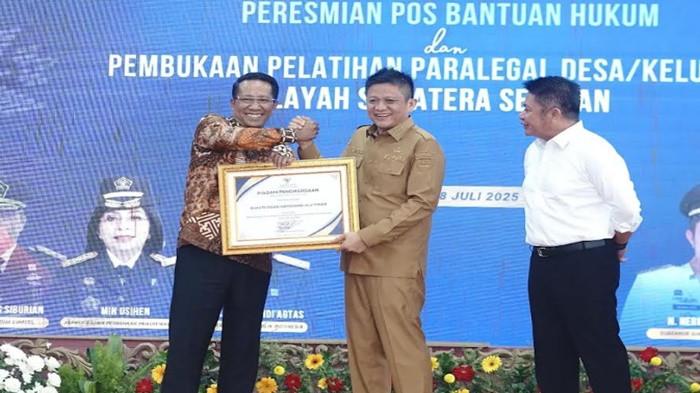 Penghargaan tersebut diserahkan dalam acara Peresmian Posbankum dan Pembukaan Pelatihan Paralegal Desa/Kelurahan Wilayah Sumatera Selatan yang berlangsung di Griya Agung, Palembang, Senin (28/7/2025).