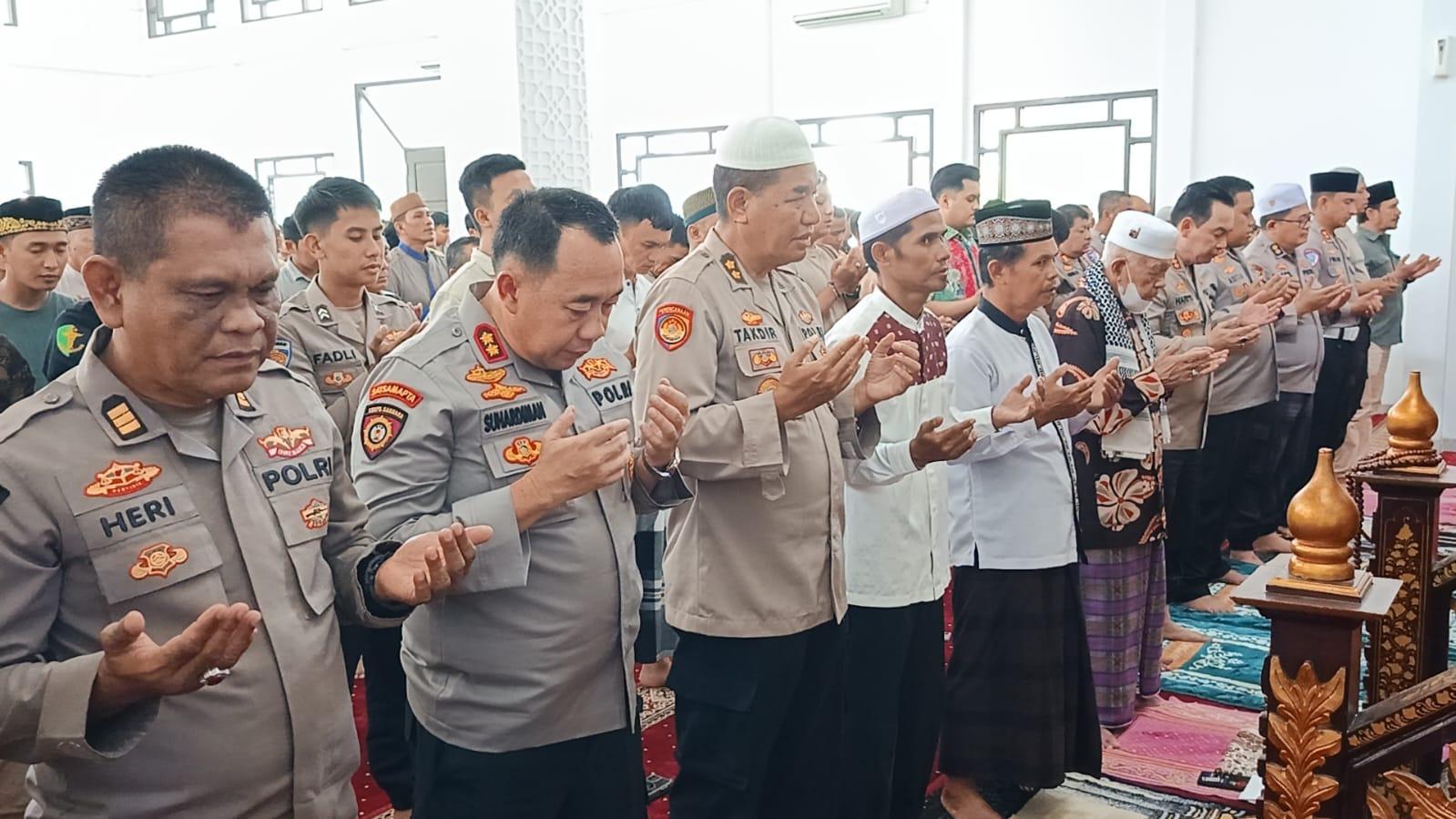 Usai menjalankan sholat Jumat, (29/8/2025). Anggota polisi dan masyarakat di sekitar Polrestabes Palembang menggelar solat gaib.