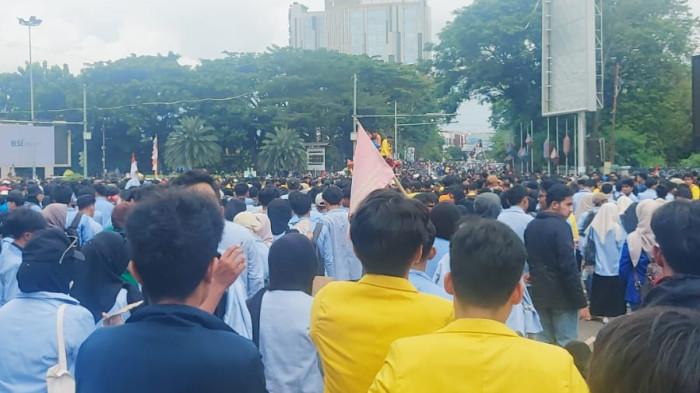 Ada tiga almamater yang kontras terlihat dalam massa aksi yang masuk ke Halaman DPRD Sumsel.