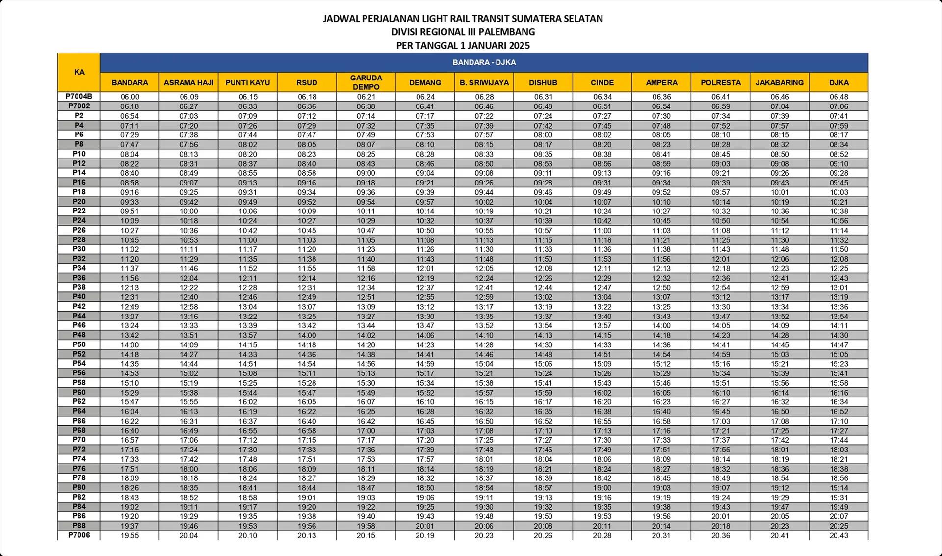 Berikut ini jadwal lengkap perjalanan Light Rail Transit (LRT) Palembang Sumsel Terbaru 2025
