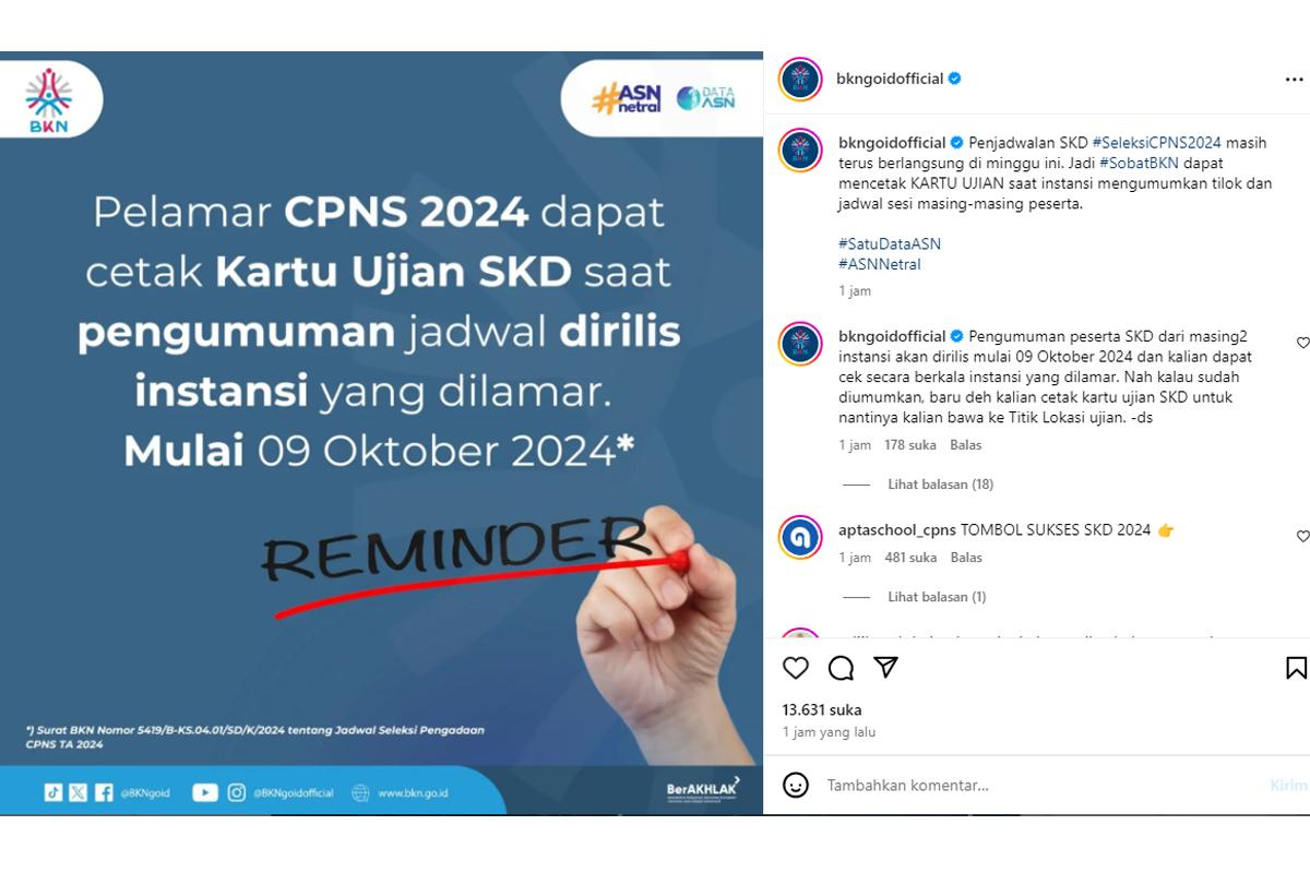 Pelamar dapat cetak Kartu Ujian SKD setelah pengumuman jadwal dan tempat tes SKD CPNS dari masing-masing Instansi yang dilamar Mulai 9 Oktober 2024