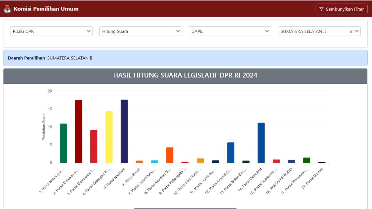 Berikut hasil perhitungan cepat surat suara DPR RI di Sumatera Selatan (Sumsel) Dapil 2 berdasarkan real count sementara Komisi Pemiliha Umum (KPU).