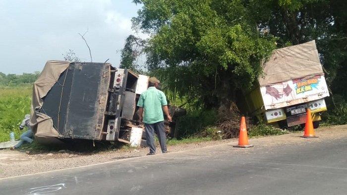 Pemotor Wanita Berhenti Mendadak, 2 Truk Terbalik Pagi Tadi di Jalintim Kayuagung OKI
