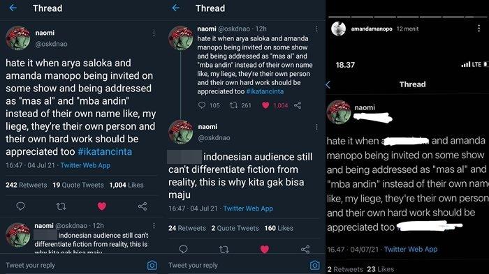 Artis peran Amanda Manopo mengunggah ulang cuitan pengguna Twitter soal keresahan nama peran yang lebih dikenal ketimbang nama diri, tetapi dihapus