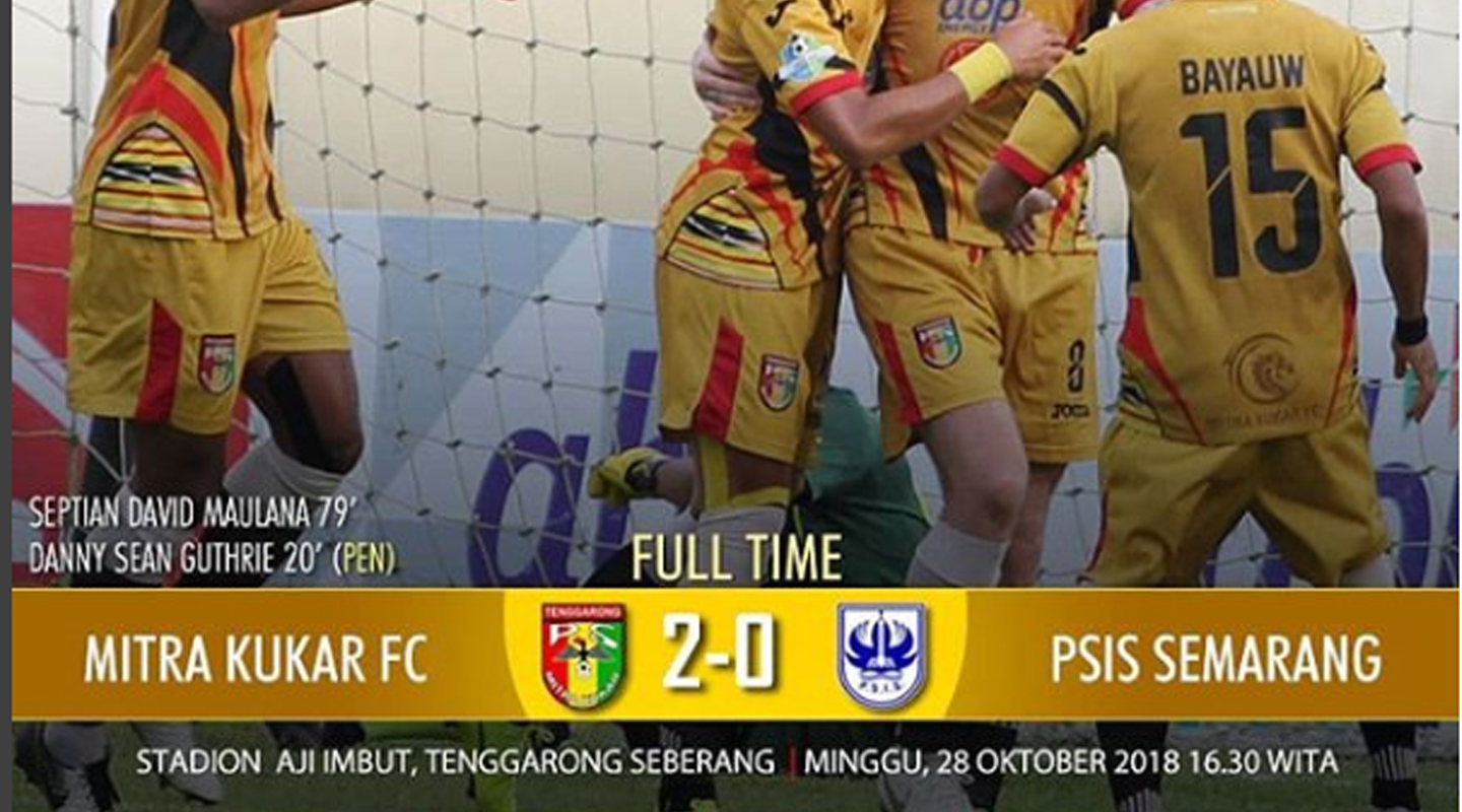 Hasil akhir pertandingan Liga 1 Pekan 28 antara Mitra Kukar vs PSIS Minggu (28/10/2018) Skor 2 - 0 berakhir