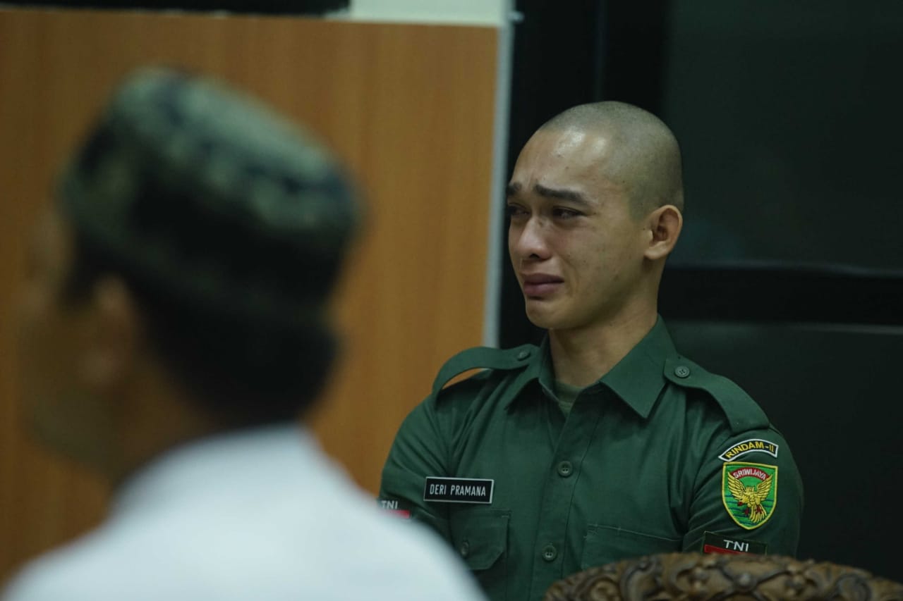 Berstatus sebagai terdakwa, Prada Deri Pramana terlihat terus menunduk dengan raut wajah sedih dan sesekali menarik nafas panjang