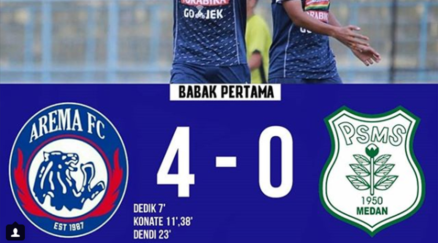 Hasil skor babak pertama Arema FC vs PSMS Medan di babak pertama adalah 4-0, Minggu sore (28/10/2018).