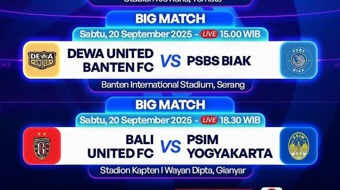 Berikut jadwal tayang acara TV pada Sabtu, (20/9/2025) Super League 2025/2026 LIVE Dewa United FC vs PSBS Biak pukul 15.00 wib di Indosiar.